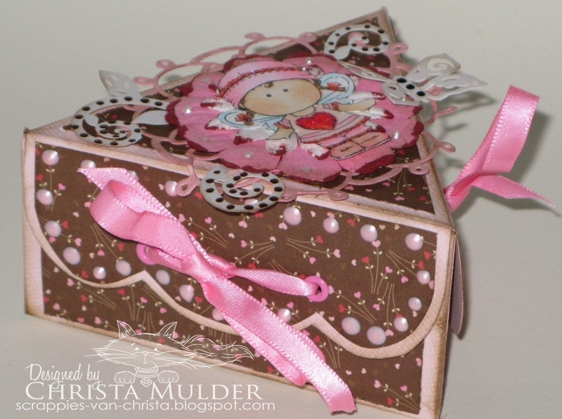 Ik heb een doosje gepimpt,normaal zou ik de randjes ook bekleden maar vond het zo leuk gezicht met die, chocohartjes ( doosje van de hema), dacht meteen aan mijn vriendinnetje Martine :) die vind dat vast lekker :)