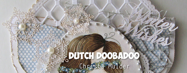 Een stuk kant achter de Gorjuss stempel, het wier heb ik erbij gekleurd met distress inkt en in het wier wat parels aangezet met de Dutch Pearl Pen Black 28 ml bl.spraynozzle Artikelnummer: 870.003.090 en de Dutch Pearl Pen White 28 ml bl.spraynozzle Artikelnummer: 870.003.010.